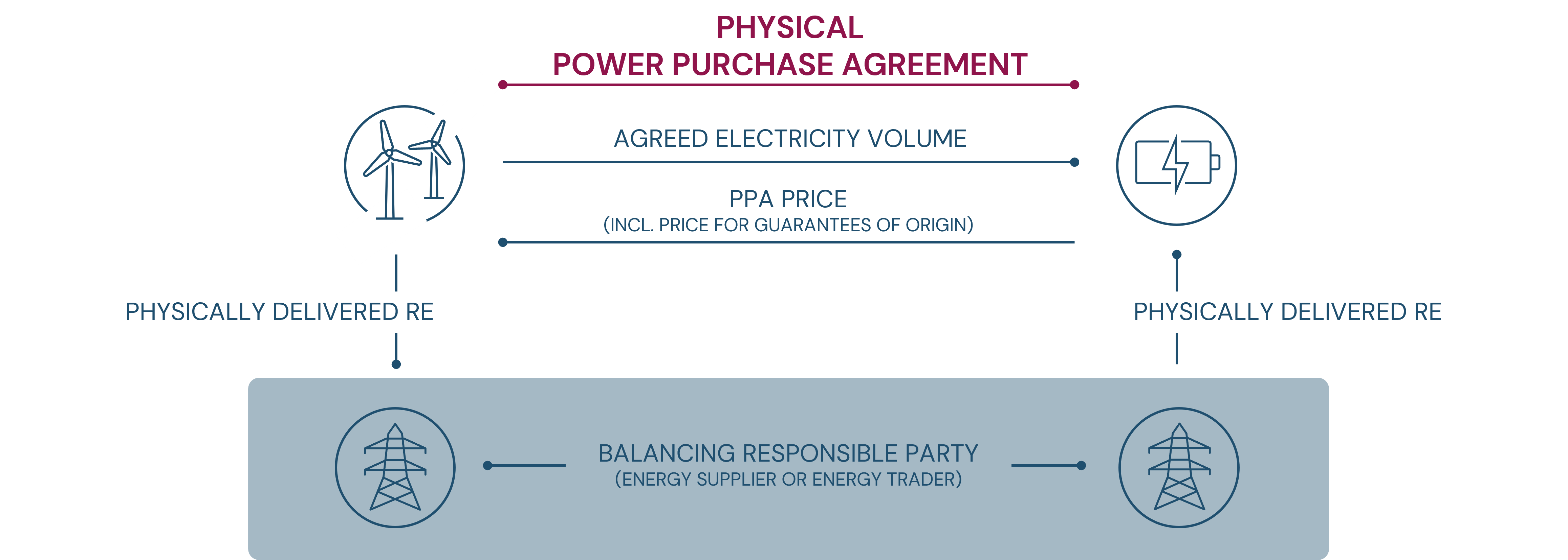 A physical PPA involves the physical delivery of the contractually agreed amount of renewable energy by a third party (energy supply company or energy trader) via the public power grid. The contract covers the supply of a fixed or variable quantity of green electricity at a bilaterally determined pricing mechanism.