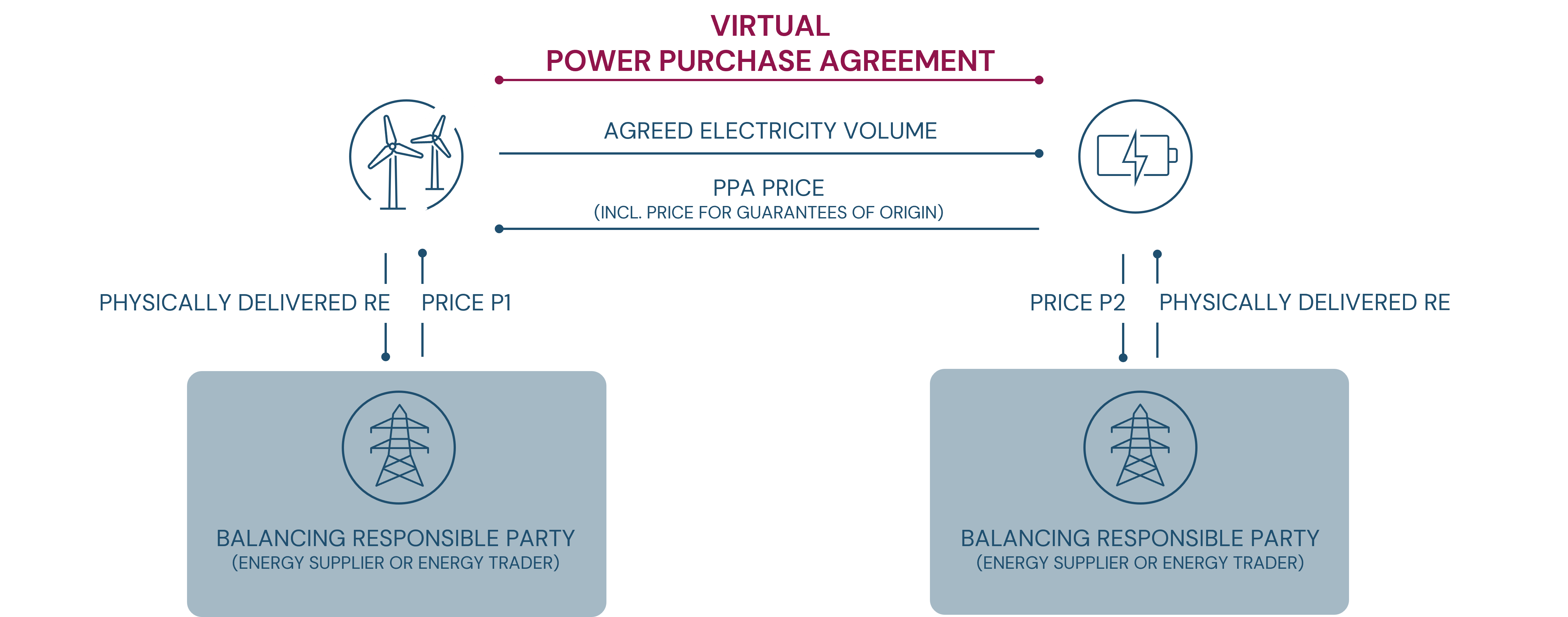 In off-site PPAs, the public power grid is used to transport electricity. As part of the PPA, guarantees of origin are transferred from the Special Purpose Vehicle (SPV) to the industrial end user. This can be done on the basis of two types of off-site PPAs: physical PPAs, which include the physical delivery of electricity from renewable energy sources, and virtual PPAs, which simply provide financial protection against fluctuating electricity market prices.
