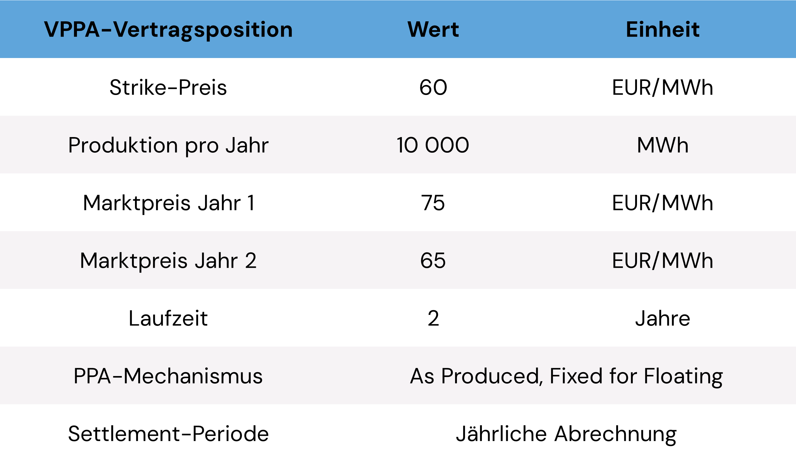 Nachfolgend erfolgt die Darstellung der bilanziellen Behandlung des VPPAs für ein Jahr innerhalb der Laufzeit unter der Annahme, dass es für Hedge Accounting designiert wird. Das Hedging Volumen liegt annahmegemäß unterhalb des physischen Stromverbrauchs, sodass kein ineffektiver Teil des Hedges entsteht (der sofort zum Fair Value erfolgswirksam angesetzt werden müsste). Die nachfolgende Tabelle zeigt die wesentlichen PPA-Annahmen.