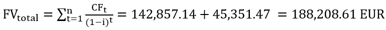 Es ist ferner von einem Diskontierungszins von 5% über die beiden Jahre auszugehen. Daraus ergibt sich im Jahr 1 ein Cashflow von (75-60) x 10.000 = 150.000 EUR und im Jahr 2 (65-60) x 10.000 = 50.000 EUR. Zur Fair Value Bewertung ergeben sich dabei folgende Werte: