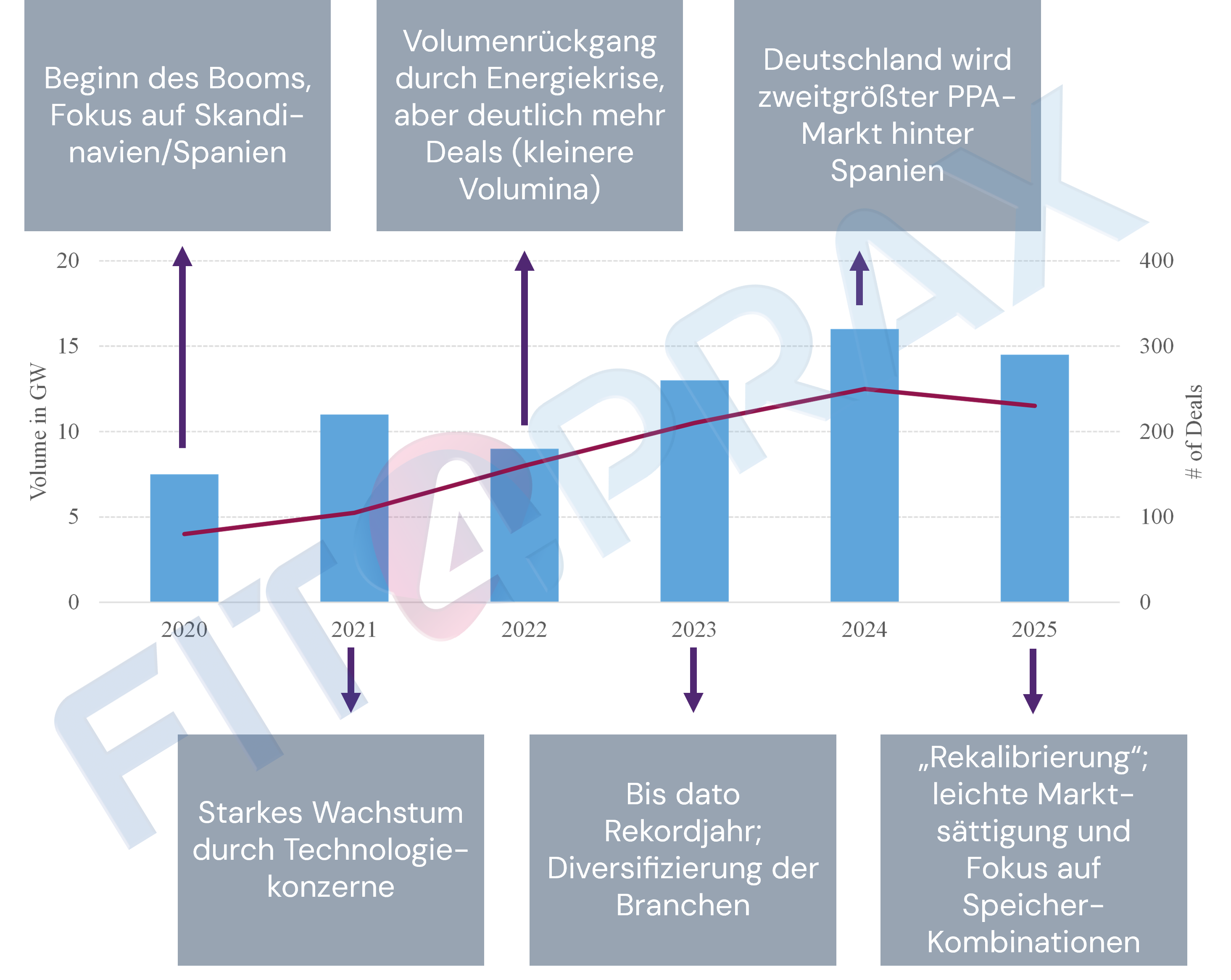 Der Markt für (v)PPAs hat sich in den letzten fünf Jahren von einem Nischenmarkt für Tech-Giganten zu einem zentralen Risikomanagement-Tool der breiten Industrie gewandelt. Diese Entwicklung verlief in mehreren Phasen: Zwischen 2020 und 2021 dienten VPPAs primär dem „Green Marketing“ und der Erreichung von Nachhaltigkeitszielen durch globale Konzerne. Die Volumina konzentrierten sich auf wenige Vorreitermärkte wie Spanien und Skandinavien. Im Jahr 2022 wirkte die Energiekrise als Katalysator. Der Fokus verschob sich schlagartig von der Ökologie zur ökonomischen Absicherung. VPPAs wurden als „Hedge“ gegen explodierende Spotmarktpreiseunverzichtbar. In den nachfolgenden Jahren 2023 bis 2025 erreichte der europäische VPPA-Markt Rekordvolumina und eine neue geografische Breite, wobei Deutschland zum Top-Markt aufstieg. VPPAs sind heute standardisiert und für den Mittelstand zugänglich. Allerdings ist die bilanzielle Darstellung dieser Vertragsform unverändert eine der größten Hürden, warum institutionelle Endverbraucherzögern diese Verträge abzuschließen.
